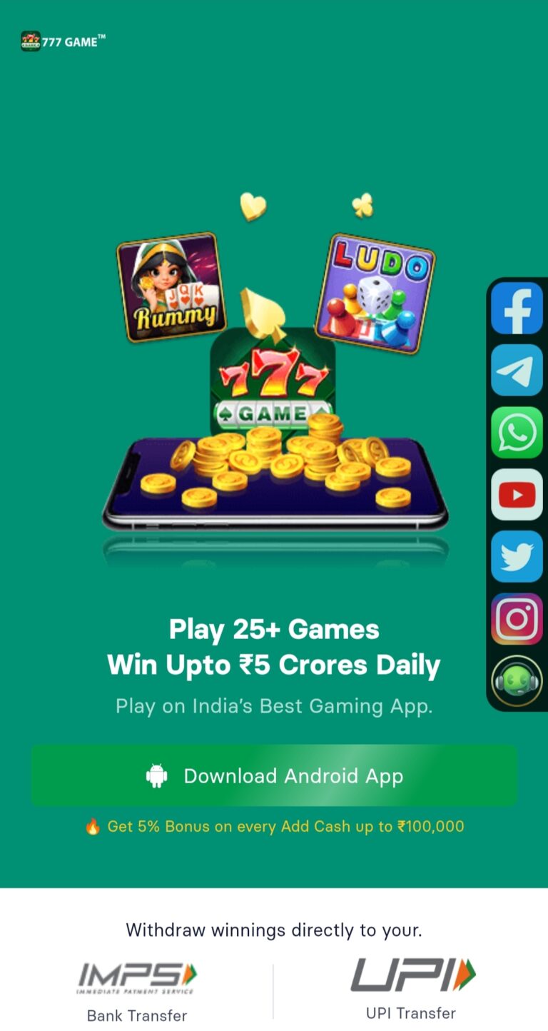 Welcome To 777 GAME Yono App Download Fast New Yono Lunch Bonus ₹55-555 free 777 GAME Online Earning Platform 777 GAME I also Game Play Ludo, poker, teen patti, Slots Game, Mini-Games, Make Colour Predictions & Participate In Quizzes And Other skills Games 777 GAME withdrawal Amount 100 Rupees Best India Game Platform Trusted By 1 Crore Player With 4.1 Ranking.